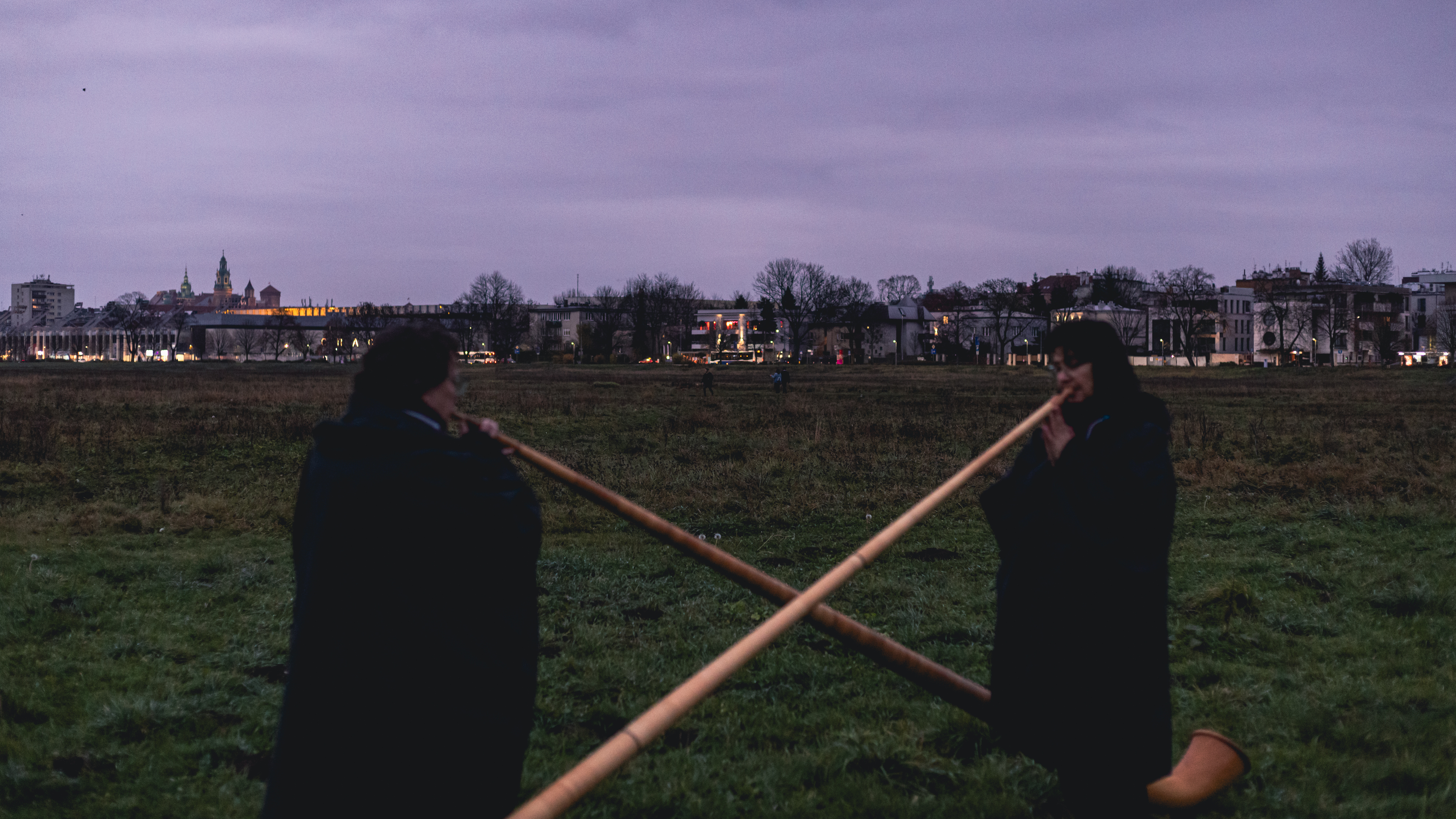 Każda część trwała godzinę, stając się okazją do kontemplacji upływu czasu i obserwacji spektaklu światła na niebie. Kompozycja była prosta: składała się z harmonicznych pasm, które przenikały się w przestrzeni. Utwór jest przewidziany na dziesięć rogów alpejskich, ustawionych parami w różnych punktach, co tworzy lokalny efekt „stereo”. Akustyka miejsc była zróżnicowana: na Kopcu Kraka urozmaicony teren pozwalał wejść na szczyt i objąć dzieło całościowo, lub spacerować wśród muzyków, doświadczając utworu z bliska, podczas gdy w tle majaczył romantyczny kamieniołom Liban. Szkoda, że nie udało się dokładniej zbadać, jak dźwięk rogów odbijał się od kamiennych ścian. Istotna była też swoboda ruchu odbiorcy: wybierając własną trajektorię, każdy sam kształtował sposób percepcji dzieła. Błonia oferowały mniej topograficznych urozmaiceń, ale wprowadzały inny krajobraz dźwiękowy, subtelnie wypełniający przestrzeń i stanowiący tło dla muzyki. Na Kopcu Kraka odległe dźwięki miasta tworzyły jedynie delikatną, pulsującą warstwę w tle. Najmocniejszym akcentem pozostawały jednak dzwony, rozbrzmiewające na początku lub końcu utworu – w zależności od tego, czy część odbywała się o wschodzie, czy o zachodzie słońca. Na Błoniach pejzaż akustyczny był zupełnie inny: wyraźny szum samochodów, krakanie wron i gawronów, a od czasu do czasu sygnał karetki, chwilowo dominujący nad całością.