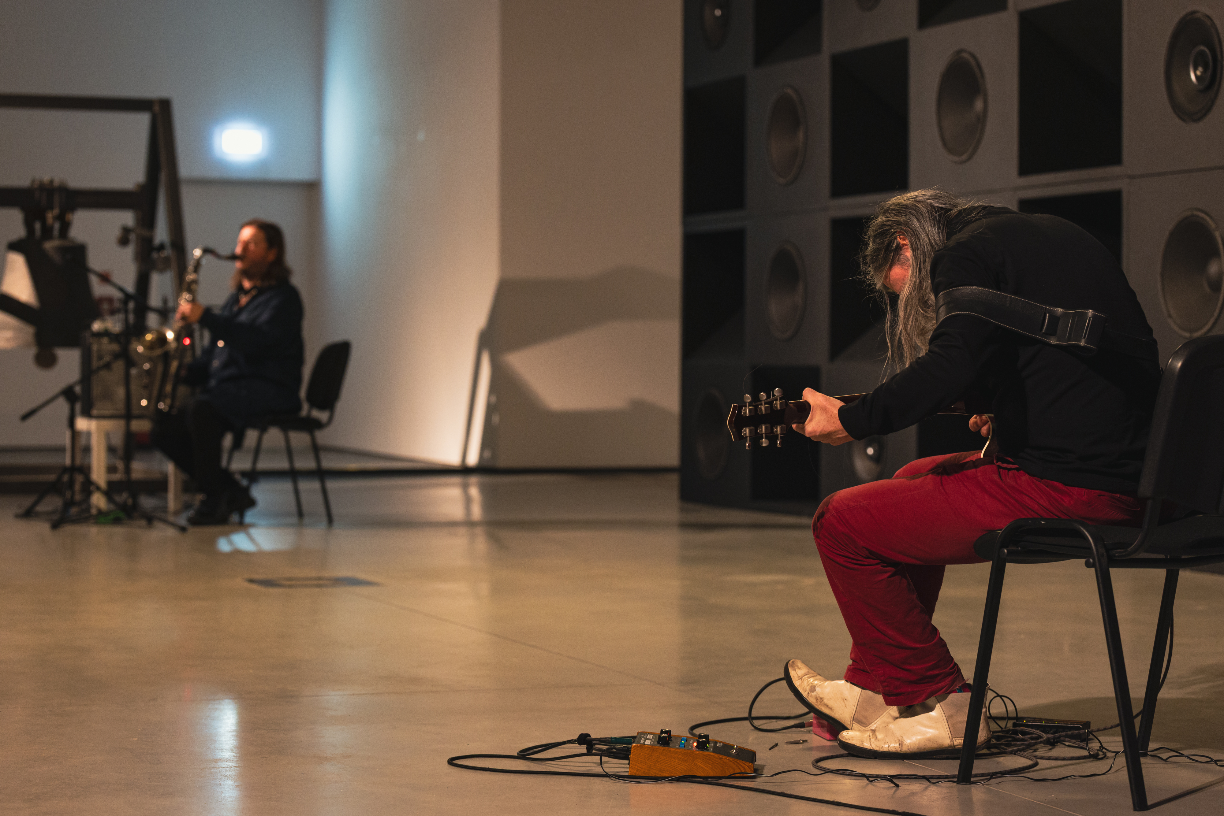 Duet Marek Pospieszalski (saksofony) i Guilhem Lacroux (gitara elektryczna) podszedł do instalacji w sposób bardziej pośredni, choć równie sugestywny. Pospieszalski, tegoroczny rezydent festiwalu, stosował różnorodne zabiegi z saksofonem, w tym świadome nakładanie instrumentu na mikrofon, generując kontrolowane i precyzyjne sprzężenia zwrotne. Lacroux nie szukał kompromisów – jego gra była mocna, momentami dronowa, pulsująca napięciem. W pewnym momencie muzycy odnaleźli wspólny rytm, zaczęli frazować razem, naśladując brzmienie i rytm bicia dzwonów instalacji. Ta synchronizacja tworzyła wrażenie niemal organicznego dialogu między instrumentami a przestrzenią, w której dźwięk stawał się doświadczeniem fizycznym.
