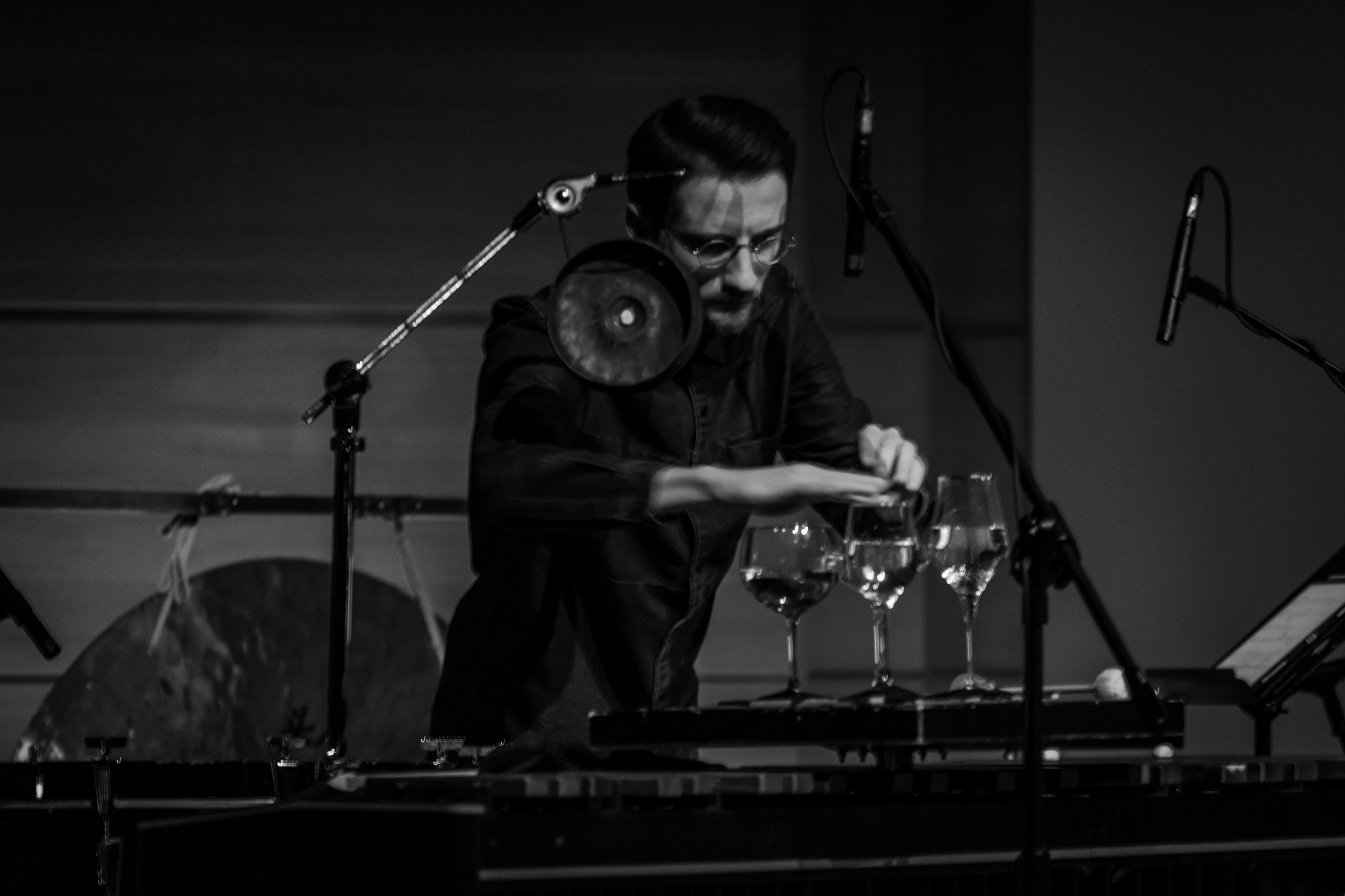 Duet Jérôme Noetinger (magnetofony szpulowe) i Jakob Kullberg (wiolonczela) również wszedł w subtelny dialog z instalacją. Muzycy sięgnęli po filcowe serca dzwonów, a w połączeniu z szumem powstającym podczas manipulacji taśmami szpulowymi oraz głębokim brzmieniem wiolonczeli powstała spójna, choć pełna nieregularności struktura dźwiękowa. Nie brakowało fascynujących efektów technicznych charakterystycznych dla pracy Noetingera – zwłaszcza stosowania delay’a poprzez naciąganie taśmy na obiekty umieszczone w pewnej odległości od magnetofonu, co wydłużało jej przebieg i generowało niespodziewane echa. Na zakończenie Noetinger owinął taśmę wokół obu dzwonów, wydzielając przestrzeń i nadając kompozycji nową perspektywę, w której materia dźwięku, instrumenty i instalacja stapiały się w jeden złożony organizm.