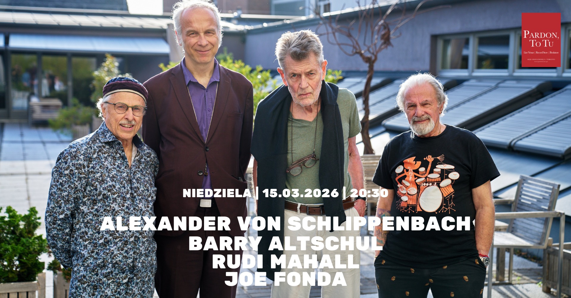 Drodzy goście, czujemy się zaszczyceni móc zaprosić na koncert z legendami światowego free jazzu jakimi są: pianista i jeden z założycieli europejskiej sceny free jazzu – Alexander von Schlippenbach; perkusista, członek zespołu „Paul Bley Trio” i założyciel zespołu Circle (Chick Corea / Dave Holland / Anthony Braxton) – Barry Altschul; niemiecki klarnecista Rudi Mahall i wieloletni współpracownik Anthony’ego Braxtona – kontrabasista Joe Fonda. Warto przy okazji wspomnieć, że będzie to ich pierwszy wspólny koncert w Polsce. Zapraszamy bardzo serdecznie!