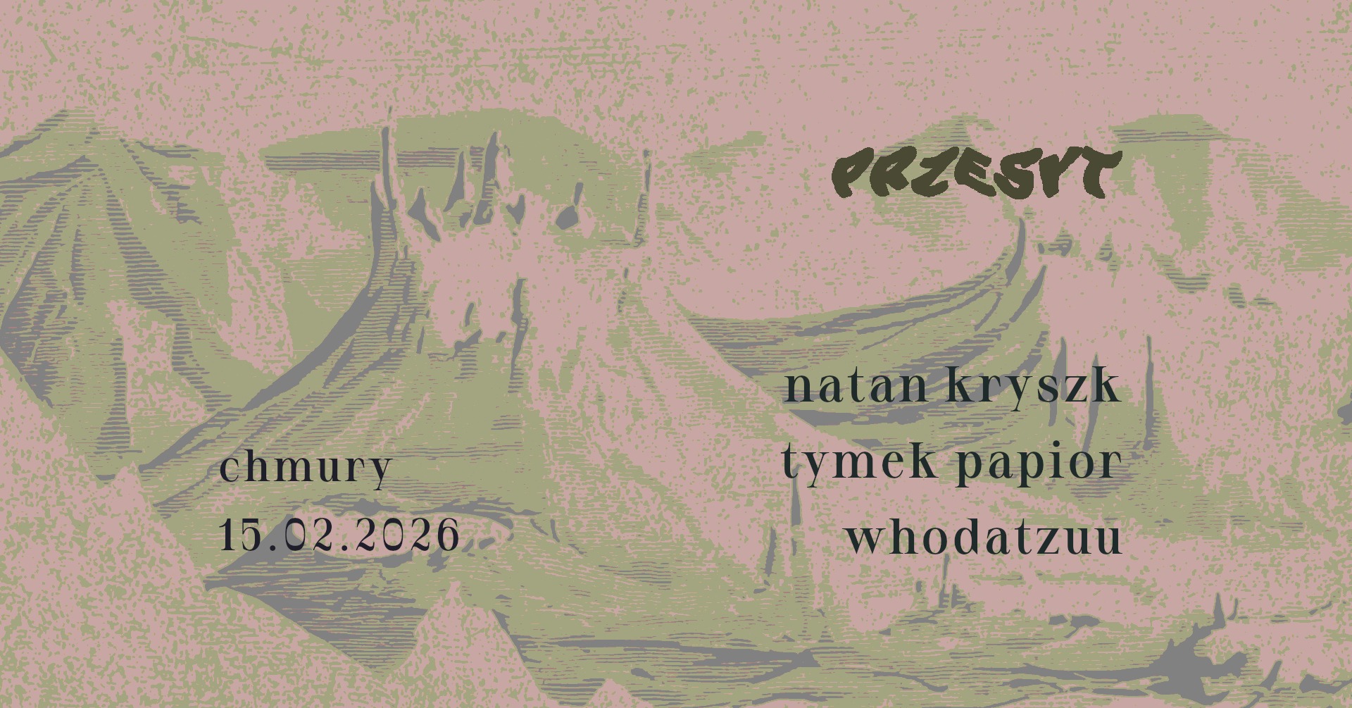 Jednoosobowa działalność mikroblogerska na rzecz polskiej muzyki Przesyt zaprasza na kolejny niedzielny wieczór koncertowy. W samym środku lutego chciałbym Wam zaproponować dwa solowe występy wyjątkowych artystów, których możemy kojarzyć zarówno ze środowiskiem jazzowym jak i eksperymentalnym. Obaj obierają za punkt wyjścia konkretny instrument, by następnie poprowadzić swoje poszukiwania w różne stylistyczne i emocjonalne rejony. Natan Kryszk swoimi saksofonowo-elektronicznymi pejzażami zaprosi nas do wielowymiarowego osobistego uniwersum, natomiast Tymek Papior wykorzystując perkusję, elektronikę i inne instrumenty podsunie nam pokręcone dźwiękowe łamigłówki. Wieczór otworzy różnorodnym dj-setem whodatzuu, dziennikarka i selektorka związana z tuba.fm i Radio Lola.